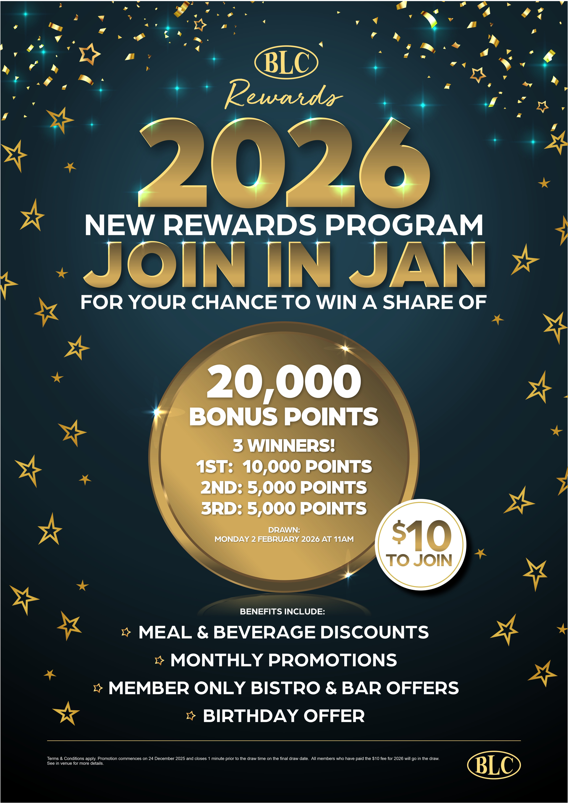 Next time you visit the Club, simply see a staff member and they can assist you with paying and processing your new 2026 BLC Rewards membership. Please be patient as we will request you complete a new form so that we can ensure we have correct and up to date information for you.