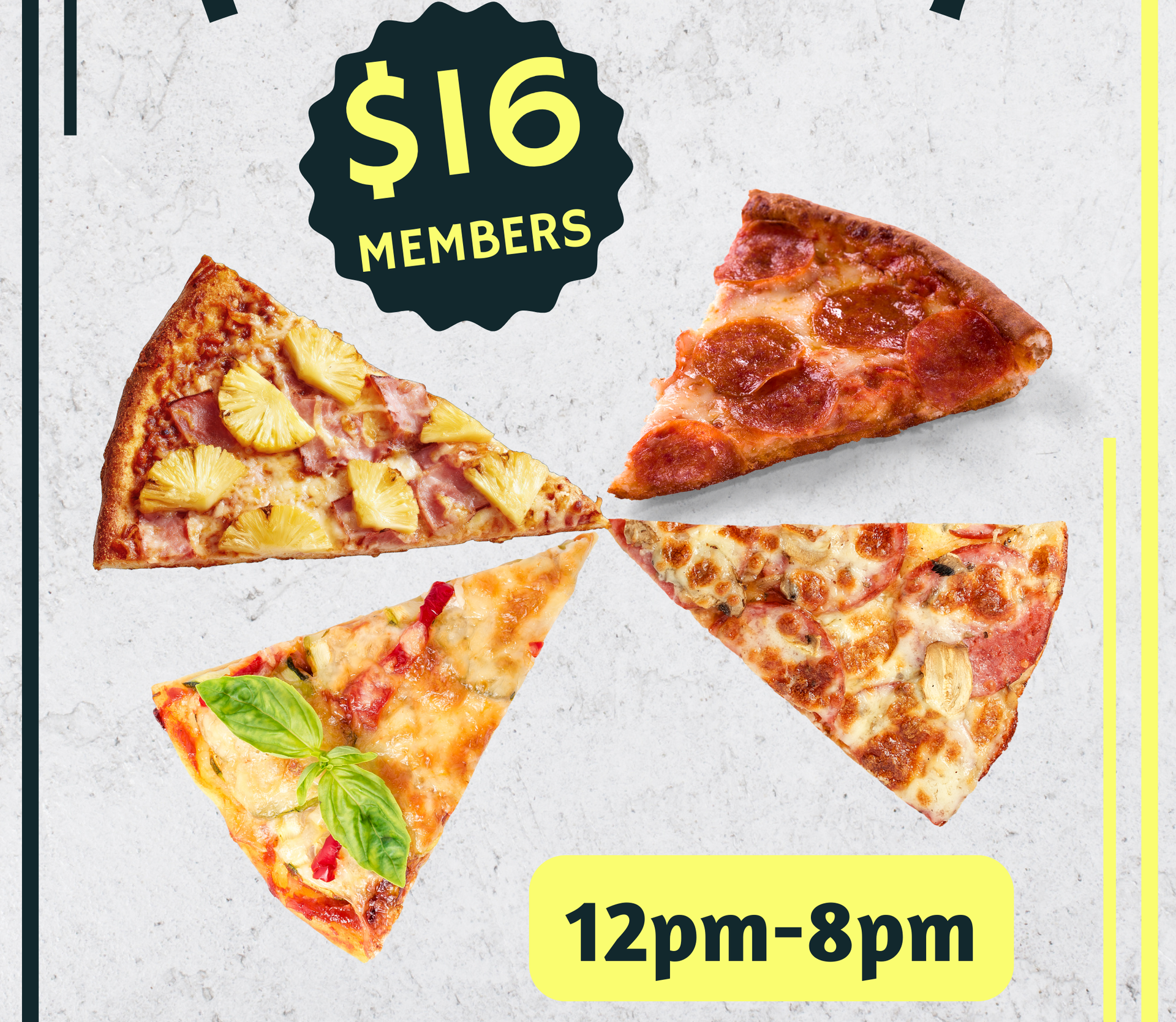 Every Tuesday 12pm-8pm choose from a variety of $16 Pizzas for Members! Not a member? Ask to join!