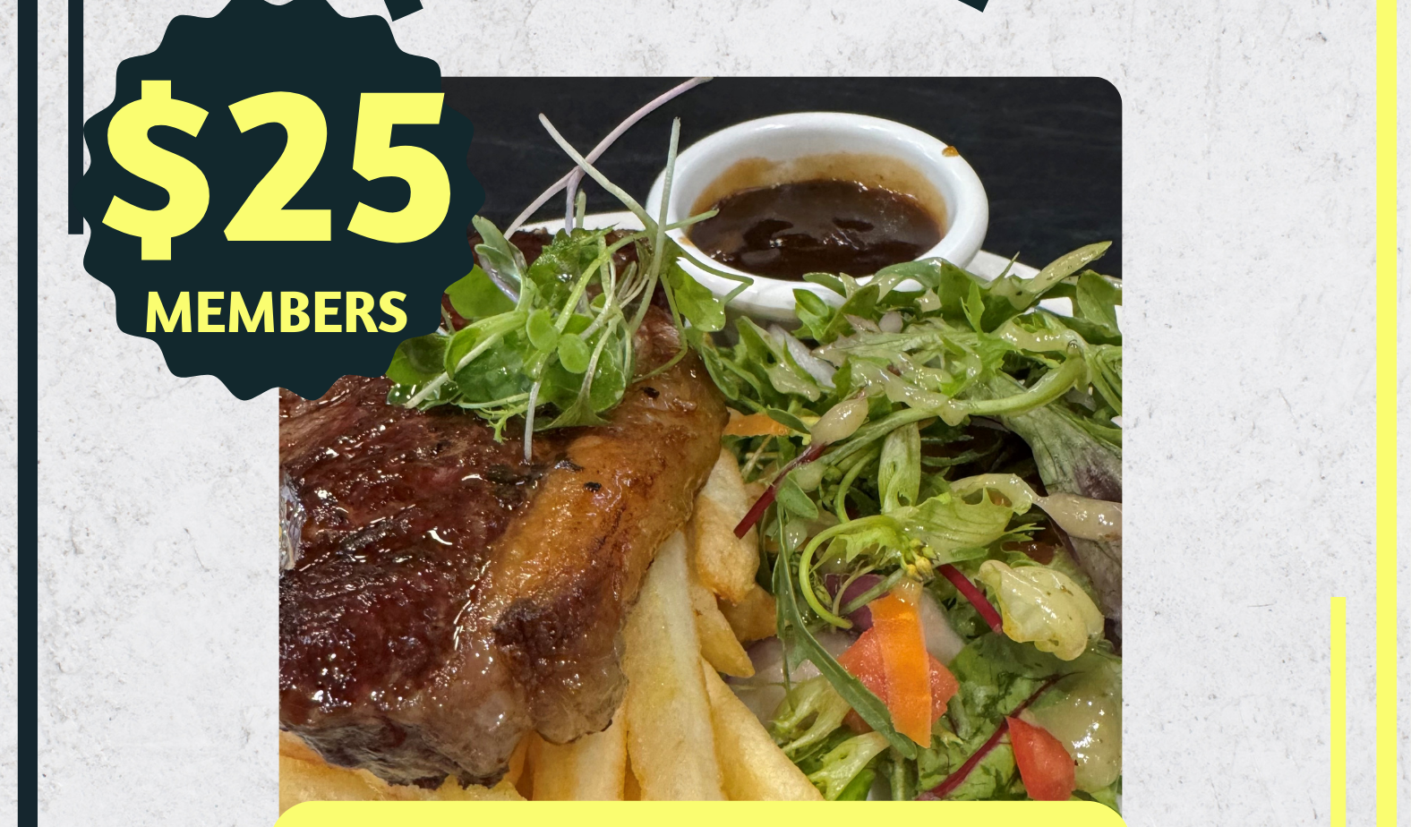 Thursday Member special! From 5pm-8pm enjoy a 250gm porterhouse, chips, salad & sauce for just $25