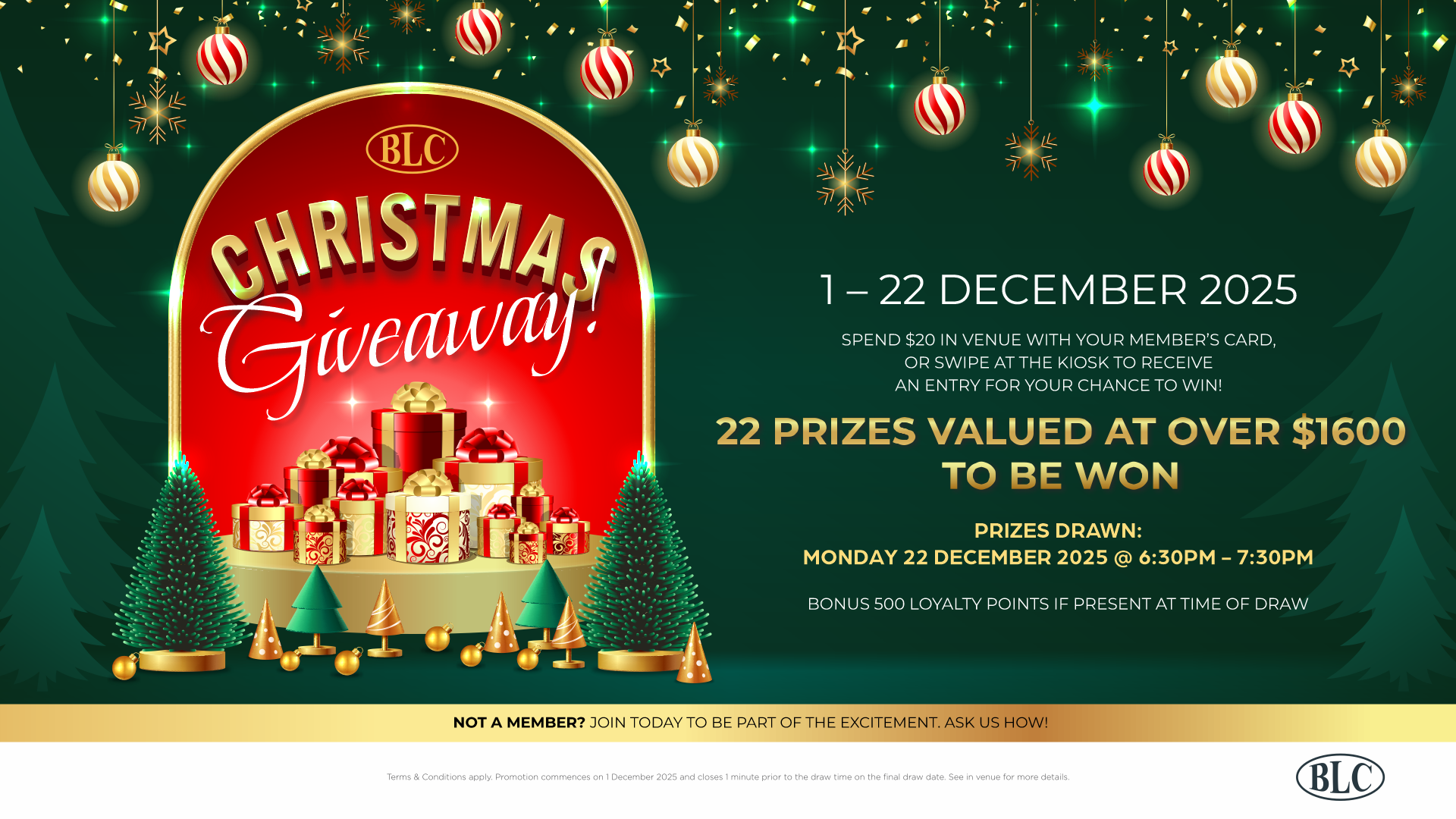 Christmas Giveaway!! Members, simply swipe your card at the kiosk to receive an entry! Earn bonus entries by spending $20 on food &/or drinks. More visits = more entries! Entries can be collected starting Monday December 1st. 22 winners will be drawn Monday December 22nd. All winners in the venue at the time of the draws will receive 500 bonus loyalty points. Not a Member? Ask our staff how to sign up for FREE!